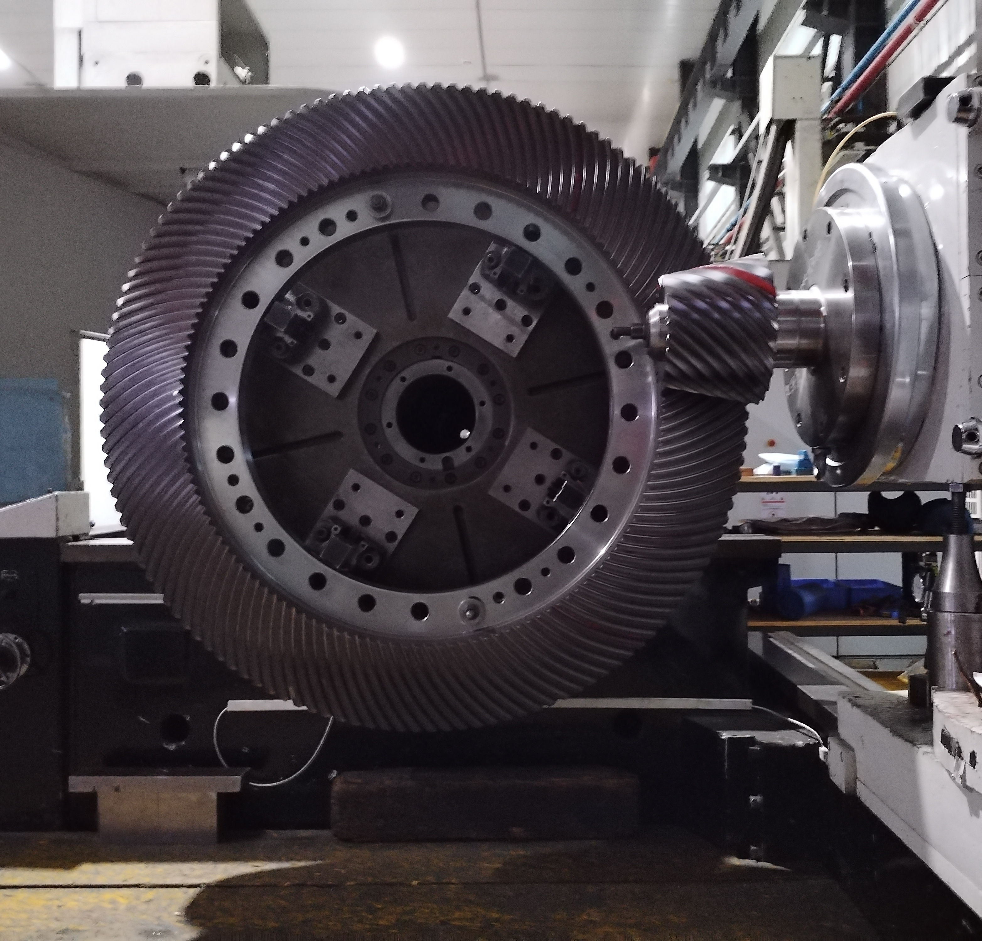 該齒輪直徑1450mm, 采用準(zhǔn)雙曲面齒制。為了降低噪音,采用加大齒寬、大偏置距設(shè)計(jì),增加了重合度。錐齒輪并非越寬越好,為了解決加大齒寬帶來的加工、嚙合等問題,對(duì)齒輪副采取LTCA分析,對(duì)系統(tǒng)用Romax進(jìn)行動(dòng)力學(xué)分析,同時(shí)利用滾檢著色進(jìn)行修形反調(diào)等技術(shù),保證傳動(dòng)嚙合的可靠性。該項(xiàng)目的成果研制,代表著我司錐齒輪設(shè)計(jì)、加工技術(shù)進(jìn)入了深入研究的階段。為大偏置距大尺寸準(zhǔn)雙曲面齒輪加工奠定了基礎(chǔ),也為超齒寬低噪聲錐齒輪的應(yīng)用積累了設(shè)計(jì)和加工經(jīng)驗(yàn)。