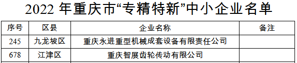 6月1日,重慶市經濟和信息化委員會公布了2022年重慶市“專精特新“中小企業名單,經主管部門審核推薦、第三方機構評審和公示等程序,重慶智展齒輪傳動有限公司、重慶永進重型機械成套設備有限責任公司均成功入選。
