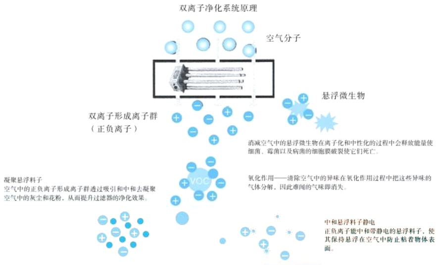 高能離子與空氣中塵埃粒子及固體顆粒碰撞,使顆粒荷電產(chǎn)生聚合作用,形成較大顆粒靠自身重力沉降下來,達(dá)到凈化目的;
